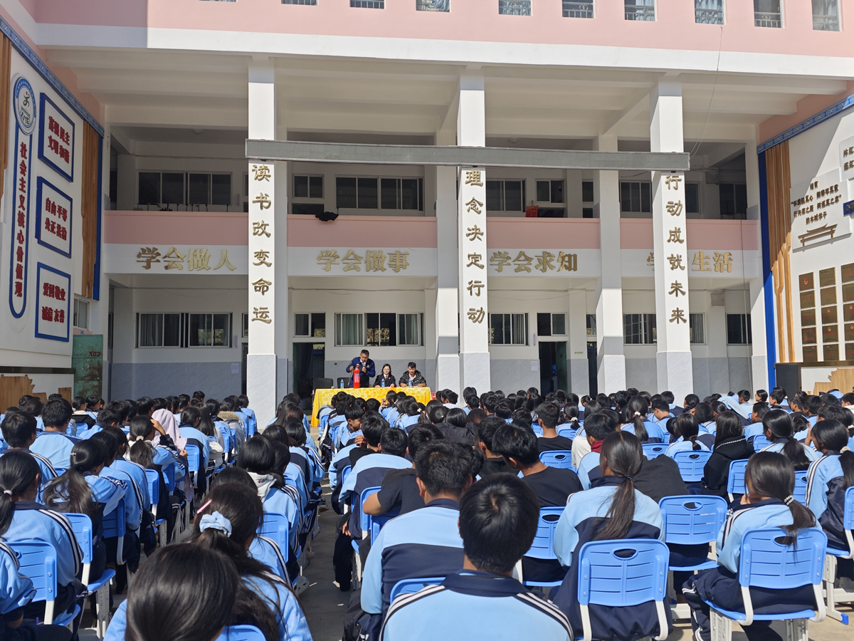 此次宣传活动采用“以案释法+案例剖析+互动游戏问答”等宣传模式,聚焦未成年人假期高频风险场景,让普法宣传更具趣味性和实效性。检察干警结合本地办案实际,向学生宣传《未成年人保护法》《治安管理处罚法》等相关法律法规,重点宣传了如何预防校园霸凌、防范电信网络诈骗、假期交通安全等知识,引导学生知法、懂法、守法,学会运用法律武器保护自己。县消防救援局的同志针对节假日期间的消防安全重点进行提示,并且现场向三百余名师生演示如何使用灭火器、消防栓等消防设施,以及火灾逃生中“低姿前行、湿毛巾捂口鼻”等实用技能,强调不私拉乱接电线、远离易燃易爆物品的安全准则,宣传活动覆盖假期安全隐患防范多方面。